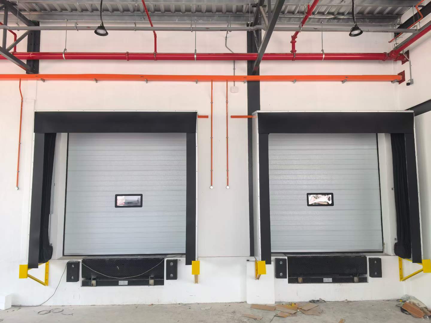 Bramy segmentowe kontrolują dostęp i utrzymują warunki wewnętrzne, a pomosty przeładunkowe zapewniają płynny załadunek i rozładunek.